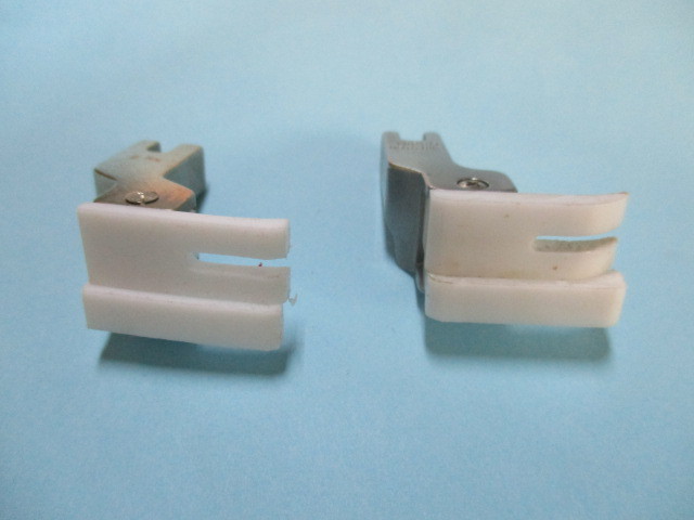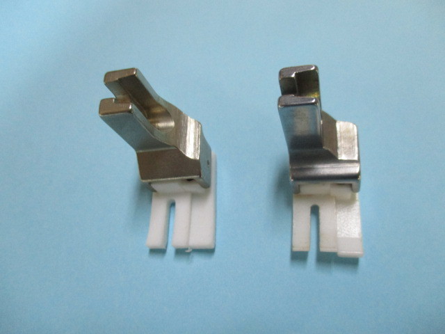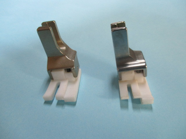 YGK及びSUISEIの右段付 テフロン押えです。 ■この商品は新品ではありますが長期在庫の商品に付、汚れ・キズ・サビ等ある場合もございますのでご了承ください。 ■写真と同一の商品をお送りするかどうかはわかりません。 ■工業用本縫いミシンで使用します(家庭用ミシンでは使用できません)。 左側がYGKのテフロン段付押え5.0mmです、右はNIPPOの5.0mmです。