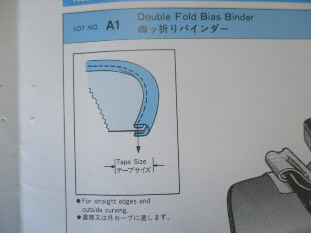 スイセイ 四ツ折りバインダー 「A1」 です。 ■この商品は中古品になります。 ■写真と同一の商品をお送りするかどうかはわかりませが、比較的きれいな物をお送りします。 ■サイズをお選びください。 ■このラッパは専用の押え金でなくても使用できますが、最後の画像にアップされています押え金を使用しますと縫い条件が良くなります。 ■工業用本縫いミシンで使用します(家庭用ミシンでは使用できません)。