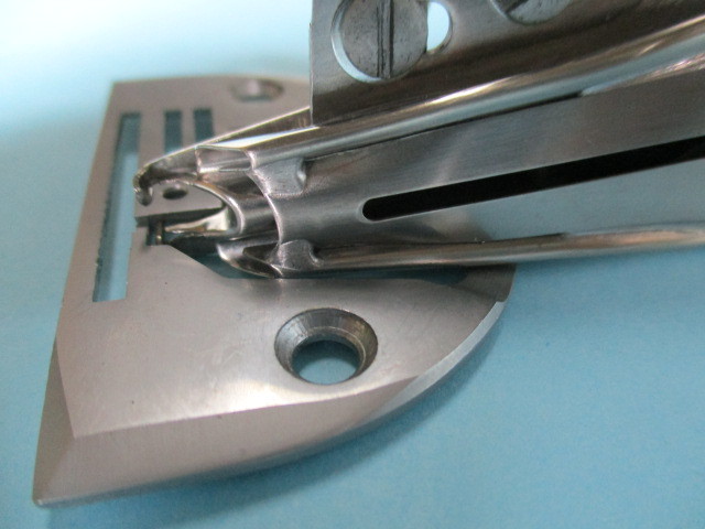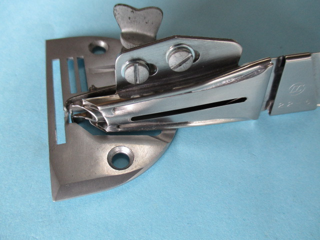 大興 の製品、針板・送り・押え付でテープ出口付近が可動調整式ですので上下の仕上がり幅を均一に仕上げることができます。。