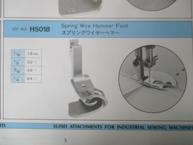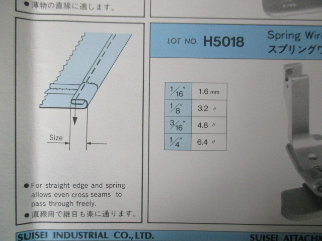 SUISEIの 「スプリングワイヤーヘマー」三巻です、記号はH5018になります。直線用で継ぎ目も楽に通ります。 ■この商品は中古品になります(一部長期在庫の新品も含まれています)。 ■写真と同一の商品をお送りするかどうかはわかりませんが、比較的きれいな物をお送りします。 ■サイズをお選びください。 ■工業用本縫いミシンで使用します(家庭用ミシンでは使用できません)。