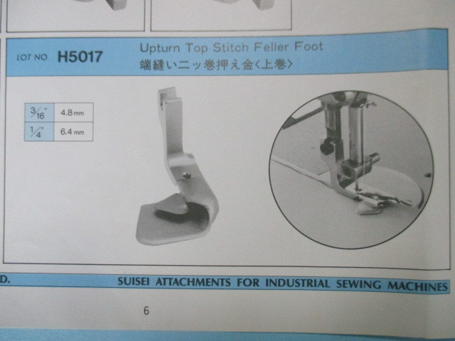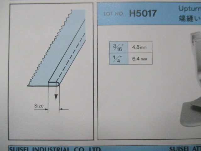 SUISEIの 「端縫い二ッ巻押え」上巻です、記号はH5017になります。 ■この商品は中古品になります(一部長期在庫の新品も含まれています)。 ■写真と同一の商品をお送りするかどうかはわかりませんが、比較的きれいな物をお送りします。 ■サイズをお選びください。 ■工業用本縫いミシンで使用します(家庭用ミシンでは使用できません)。