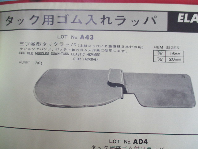 スイセイ 三巻型タックラッパ「A43」 です。 ■この商品は中古品になります。 ■写真と同一の商品をお送りするかどうかはわかりませが、比較的きれいな物をお送りします。 ■ゴム入れ作業に使用します。 ■ヘムサイズは5/8(16mm)です。 ■工業用本縫いミシンか2本針ミシンで使用します(家庭用ミシンでは使用できません)。