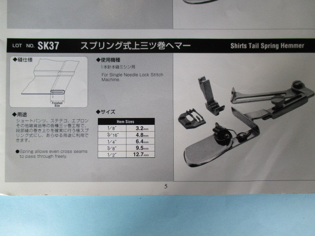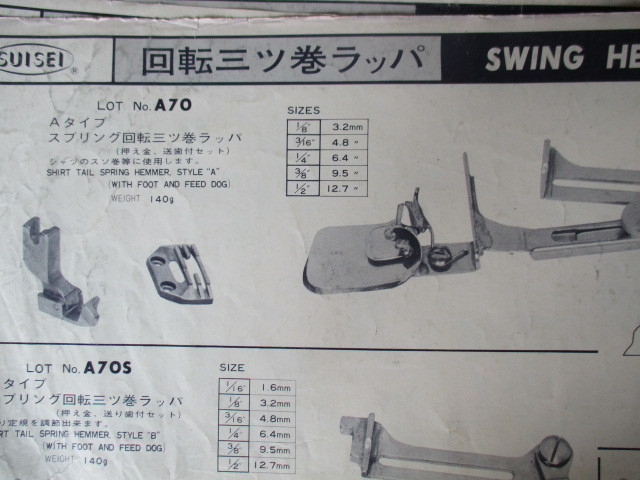 スイセイ スプリング回転三巻ラッパ 「A70」1/4(6.4mm) です、押え金・送り歯が付いています(SOKUNO 「SK 3/16(4.8mm)」もありま。