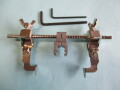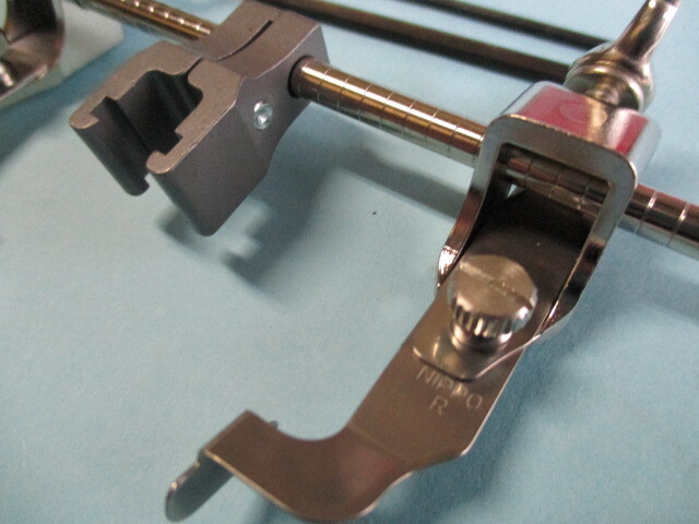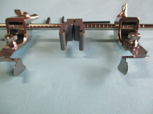 工業用の1本針千鳥ミシン及び本縫い2本針ミシンで使用しますステッチ定規です。 ●下図の図面のように平たい押え金で使用する2本針ミシン・千鳥ミシン専用のステッチ定規です。 ●向かって左右に定規がきます。 ●他のミシンでは使用できませんのでご注意ください。