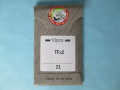工業用の厚物用ミシンに使用するミシン針です。 ■セイコーミシン 「SEIKO」 のTF-5, TF-6等のミシンで多く使用されています。 ■針の袋の色は番手によりベージュ色になる時とグリーン色になる時とがあります。 ■根っこの軸の太さは18番までが1.63mm、19番が1.91mm、20番以上が2.03mmになります。 ■番手をお選びください。