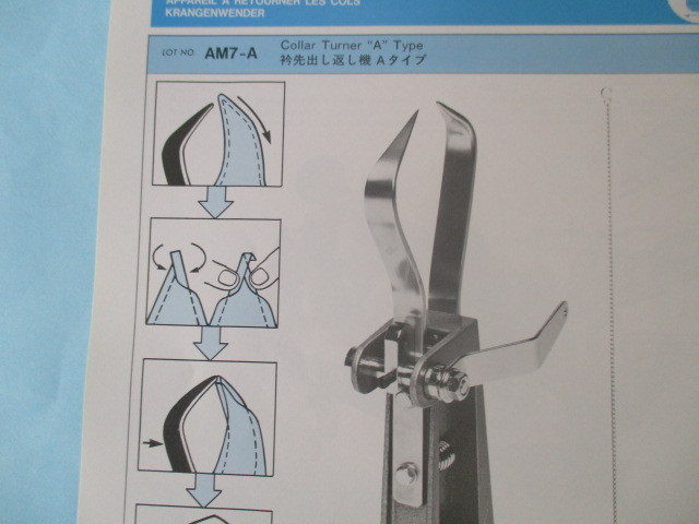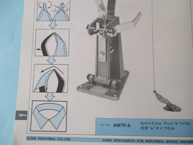 【中古品】スイセイ 「AM-7A」 衿先出し返し機Aタイプ。 ■この商品はサビ・汚れ・キズ・等ありますのでご了承ください。 ■写真と同一の商品をお送りいたします。 ■衿先がとがった衿に使用します。 ■カタログには写っていますがペダルは含まれておりませんのでご注意ください。